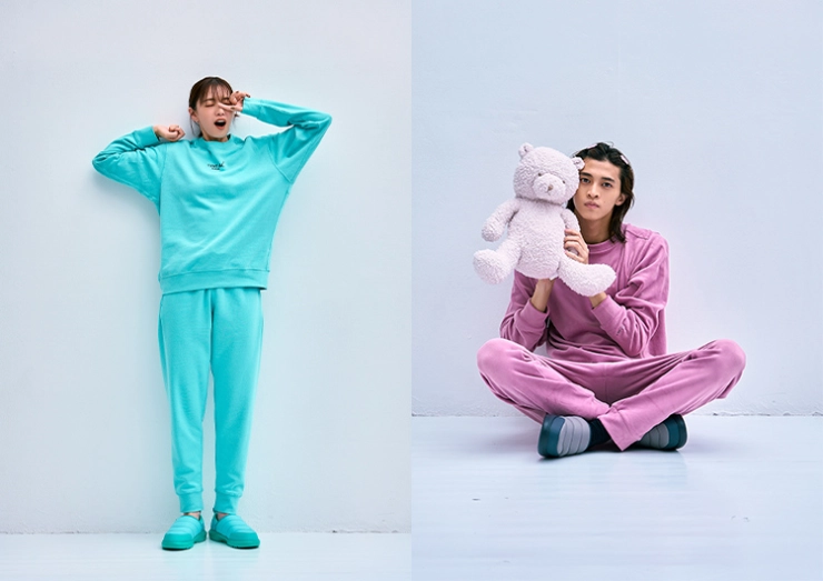 アスリートも多く愛用している話題のリカバリーウエア、TENTIALの「BAKUNE」。冬用の裏起毛になったスウェットとウォームサンダルは、ふかふかの着心地&極上のはき心地♡あえて聡子ちゃんはミント、別府さんはピンクにしてみました!