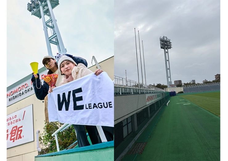 WEリーグさんから特別にお借りしたタオルやマスコットのウィーナ、クラシエのチュッパチャプスブーケを持って、客席から全力応援!サッカーは冬がいちばん盛り上がる時期なので、ぜひ応援に行ってみてね!