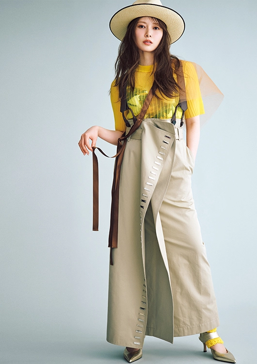 ライブリーな印象をもたらすイエローは、今季注目のトレンドカラー。シアー素材を選ぶと、そのみずみずしさがさらに引き立ちます。伝統的なコルセットを着想源としたブラトップや、トレンチコートを切り取ったようなスカートなど、もとからヴィンテージ感とモダンさが融合したアイテムを掛け合わせれば、ミックスコーデの洗練度がぐんとアップ。