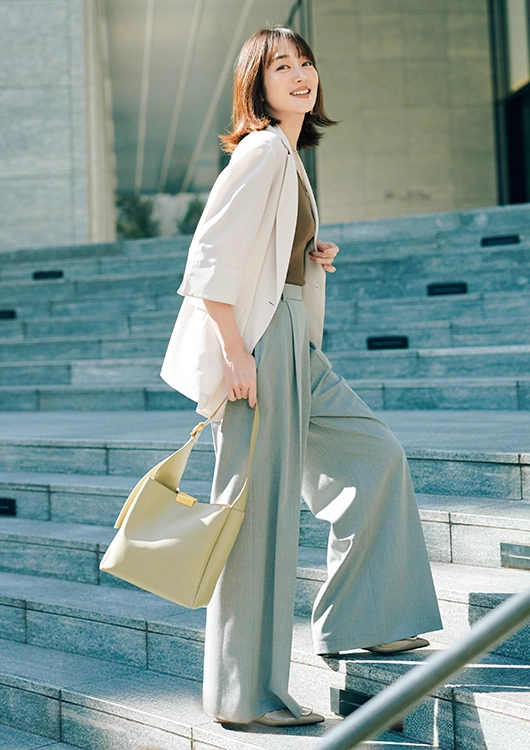オフ白ジャケットにブルーやブラウンを掛け合わせた、かっちりしつつも抜け感が漂う配色もおしゃキャリっぽい。