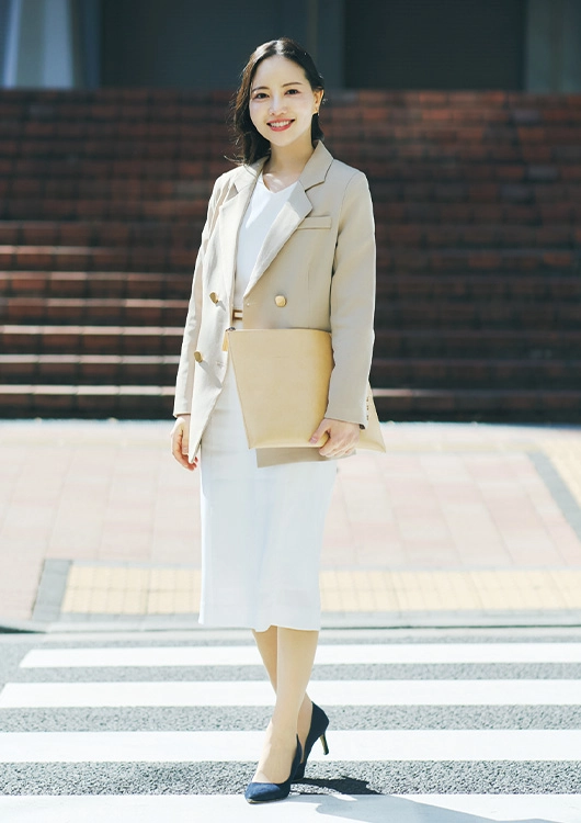 「営業職なのでジャケットが必須。きちんと感を保ちつつも、暗くなりすぎないようにベージュのジャケット×白のワンピコーデ。ワンピはハズレがないピンキー&ダイアンのものです。クラッチバッグでシャレ感UP!」(金融会社勤務/水谷映里さん・31歳)
