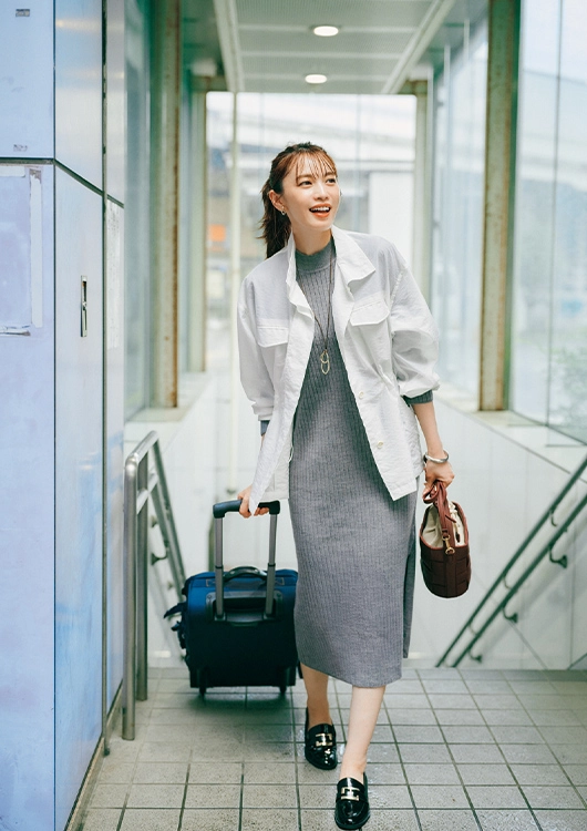 ビスチェ付きニットワンピース(ワンピース)¥3,990/GU シアーブルゾン¥37,400/アンクレイヴ(オンワード樫山) ローファー¥18,150/ダイアナ(ダイアナ 銀座本店) バケツバッグ¥6,996/デッサン(ワールド) ダブルリングネックレス¥7,920/アンタイトル バングル¥2,420/アネモネ(サンポークリエイト) メタルコンビイヤリング¥2,200/Three Four Time(ジオン商事) キャリーケース/スタイリスト私物
