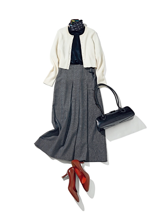 室内ではウール調の生地のスカートにベロアトップスの素材違いを楽しむ上級スタイルでテキパキお仕事。カーディガンは細身のリブで美人ムードも急上昇。