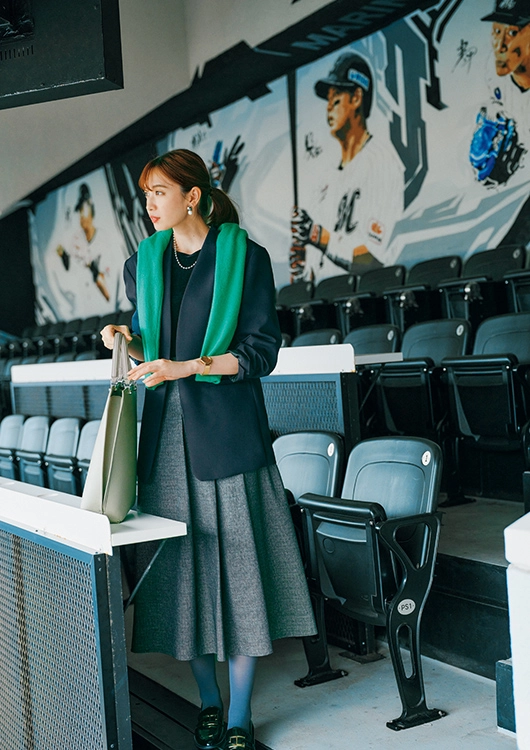 上役の方にもご挨拶する日は、JK×プリーツスカートでトラッドを意識。鮮やかな緑が映えるグリーンのニットは肩掛けしてアクセ感覚で楽しんで。
