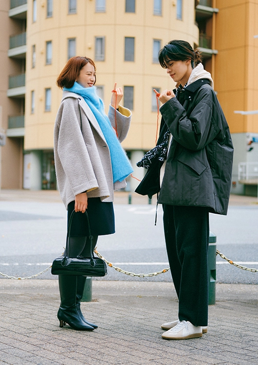 [別府さん]作コート¥47,300/スティル バイ ハンド(スタイルデパートメント) 作務衣¥17,900、手ぬぐい¥3,960/ともにSOU・SOU(SOU・SOU KYOTO 青山店) パーカ¥37,400/ウティ(にしのや) パンツ¥46,200/ブルーナボイン(ブルーナボ イン代官山店) シューズ¥27,500/リプロダクション オブ ファウンド(アイファウンド)