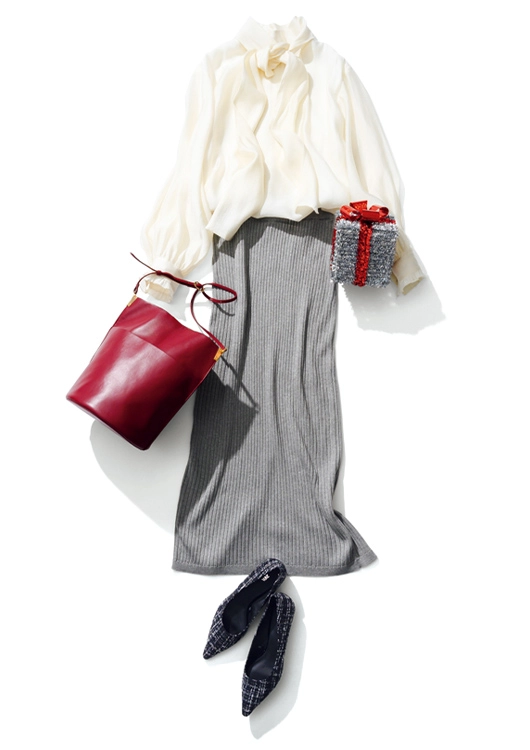 この時期に効くのは白×赤のクリスマスなカラーリング。白のブラウスは顔映りがよくて、モテ指数も高まりそう!のびのいいニットスカートは、ソファでゴロゴロしてもシワにならず楽ちん。