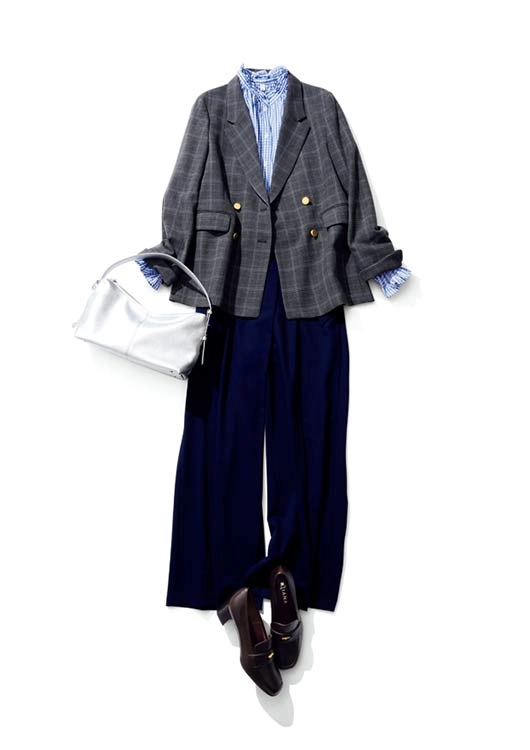 フリルネックブラウス¥2,290/GU ジャケット¥17,990/ANYSIS(オンワード樫山) ラップパンツ¥12,000/PLST シルバーバッグ¥15,400/Stola. コインローファー¥18,150/ダイアナ(ダイアナ 銀座本店)