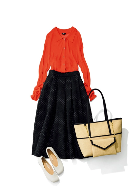 社内イベントに向けてテンションを上げたい本日は、赤カーデ×ドットスカートでプチ盛り。どちらも華やかだけど形がシンプルだから、コテコテの甘口にならず先輩っぽい!足元は白で抜けを作るのが大正解。