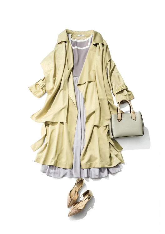 ストール付きトレンチコート¥25,960/SNIDEL ルミネ新宿2店 ニットドレス[カーディガンとセット販売]¥28,000/Her lip to ハンドバッグ¥4,480/grove(ワールド) ストラップパンプス¥13,200/アルテミス by ダイアナ(アルテミス by ダイアナ アーバンドック ららぽーと豊洲店)