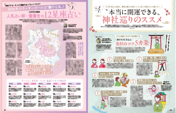 今年もやってきました♡andGIRL冬の風物詩、開運特集!今すぐできる開運術を、44ページにわたってたっぷりレクチャー。本誌おなじみの風水師・李家幽竹先生監修の開運ファッション&メイク企画には高梨臨さんが登場。さらに、テレビ番組『突然ですが占ってもいいですか?』に出演中の人気占い師・彌彌告先生による12星座占いや、神社ソムリエ・佐々木優太さんが教える「本当に運が開ける」神社巡りの方法まで、盛りだくさん!2026年もおしゃれを楽しみながら、運も味方につけていきましょ♡