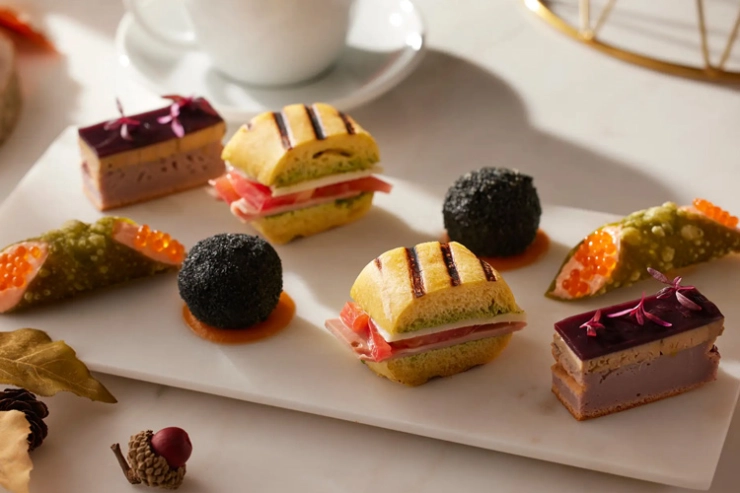 また盛り付けは〝秋の焚火〟をイメージし、落ち葉や栗を思わせるあしらいで季節感たっぷり。見た目も味も、季節を感じられるアフタヌーンティーが楽しめます。