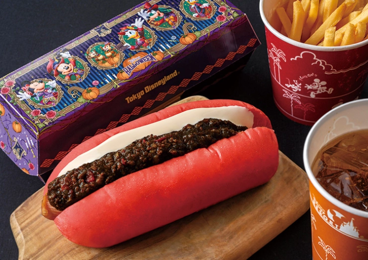 ディズニー映画『101匹わんちゃん』のクルエラ・ド・ビルをイメージしたホットドッグセット♡赤いパンに、黒いミートソースと白いチーズソースをトッピングして、クルエラの個性的なカラーリングを再現。甘辛いスウィートチリがアクセントになった大人な味わいです。/¥1,240(単品¥700)