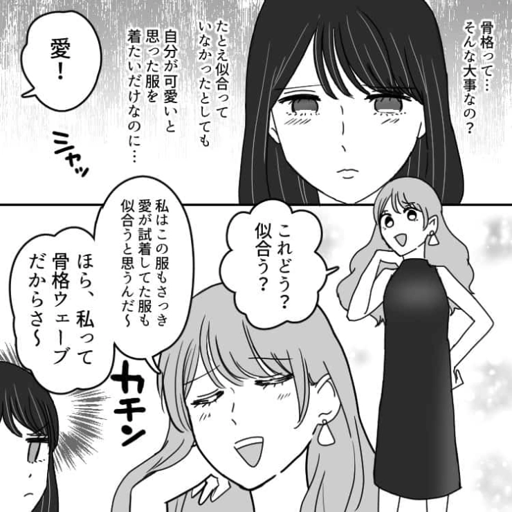 OTHER 2023.10.04後編/【骨格マウント】「私ってウェーブだからー」服選びにケチをつける友達ここ最近ブームな骨格診断。たしかに骨格に合った洋服を選ぶと着映えも良くなる!しかし囚われすぎて足しまうのも考えもの・・・。今回は、骨格診断に忠実なお友達とのショッピング中に起きた珍事件をご紹介します。123#漫画