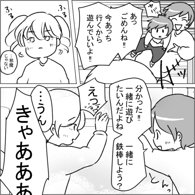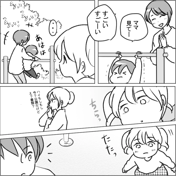女の子はどうやら息子と遊びたかった様子。鉄棒に誘ってあげたら、女の子も喜んで遊ぼうとしたところで、どこからか悲鳴が聞こえてきて・・・?