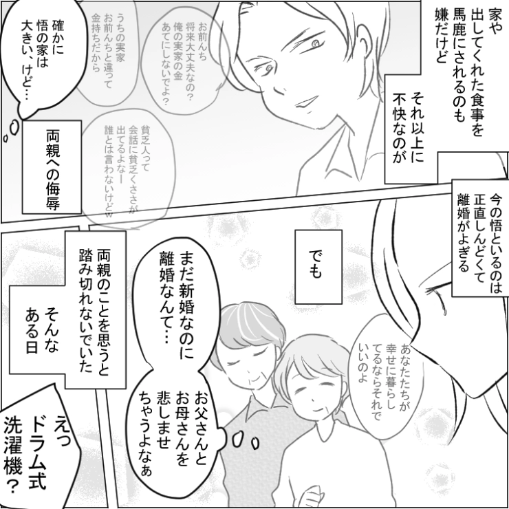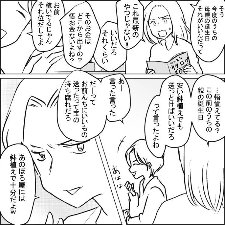 主人公の実家には安い鉢植え、自分の実家には最新家電、しかも主人公のお金で・・・。優越感に浸るを通り越してもはやモラハラの域。この後、主人公に泣きつくことになるとはこのとき知らない悟でした。