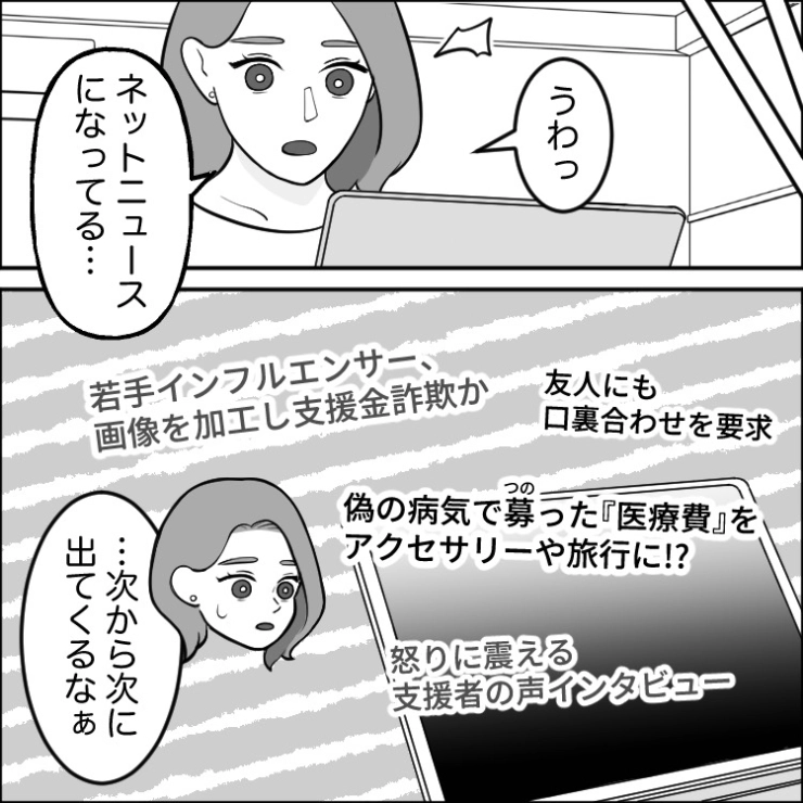 OTHER 2025.07.13後編/「病気だから助けが必要」インフルエンサーがフォロワーに支援を要求した結果、たくさんの人が募金!しかし、経過報告も病名も明かされず違和感ばかり→実は・・・衝撃のエピソードを漫画化!今回はインフルエンサーが病気になったと言ってフォロワーに支援を要請したもののなんだか違和感を感じずにはいられなかった主人公のお話をご紹介します。病名を言えなかったり、経過報告もなかったりと日に日に違和感が募ったその理由は・・・。1234#漫画