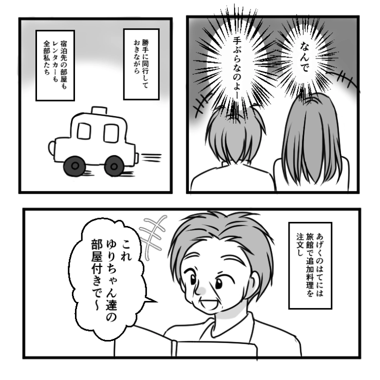 衝撃のエピソードを漫画化!今回は図々しい義母と義姉のお話をご紹介します。主人公家族の旅行に勝手についてきて予約などの手配は手伝わないどころかお金も一切払わない厚かましさ。我慢の限界に達した主人公はある方法で撃退することにしました。