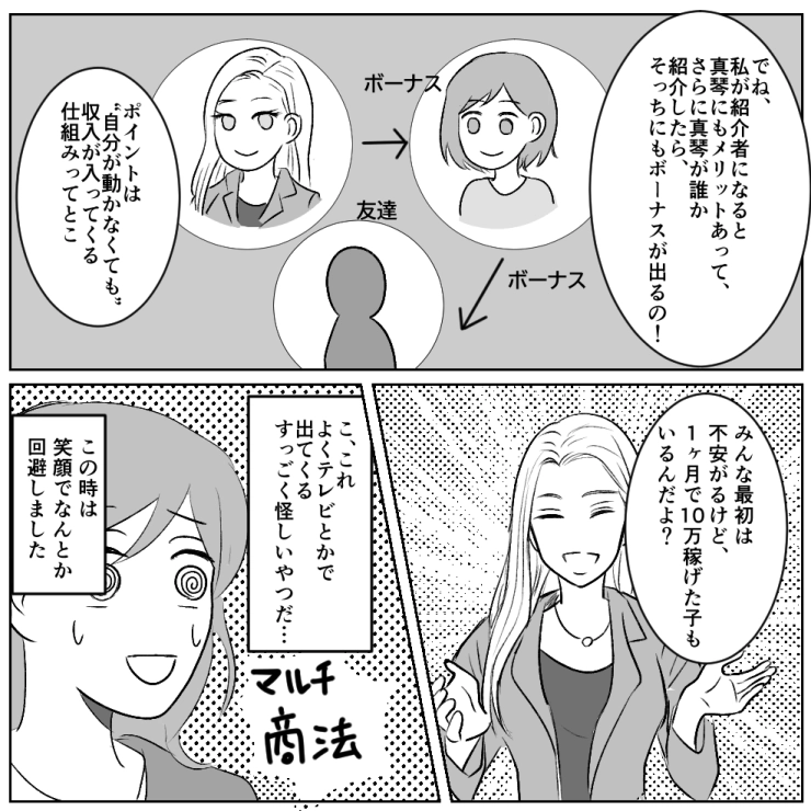 久しぶりの再会で雰囲気が大きく変わっていた友達はまさかの怪しいビジネスにハマっていました。笑顔でかわしたものの、これは勧誘の始まりにすぎず・・・。