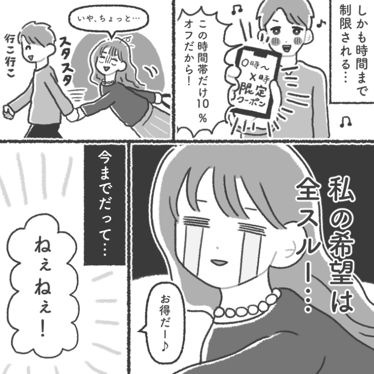 OTHER 2025.08.03「クーポンないのに行く意味ない」割引命の自称・倹約家の彼氏!節約だけでなく私の意見も聞いてとお願いした→私の誕生日に連れて行かれた場所を見て別れを決意・・・衝撃のエピソードを漫画化!今回はクーポンや割引がないお店には絶対行かない自称・倹約家の彼氏に振り回された主人公のお話をご紹介します。主人公の好みや要望は一切無視で安さ最優先な彼氏の行動に嫌気がさした主人公だったのですが・・・。123#漫画