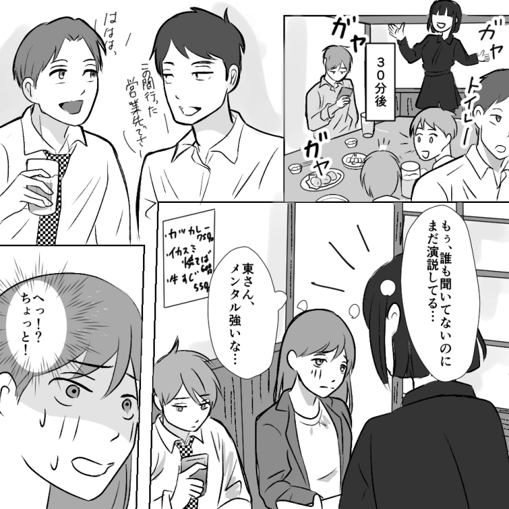 あまりの空気の読めない話に誰も聞かなくなったにも関わらず、話を続ける同僚。メンタル強いなと思って顔を上げるとそこには衝撃の光景が・・・。