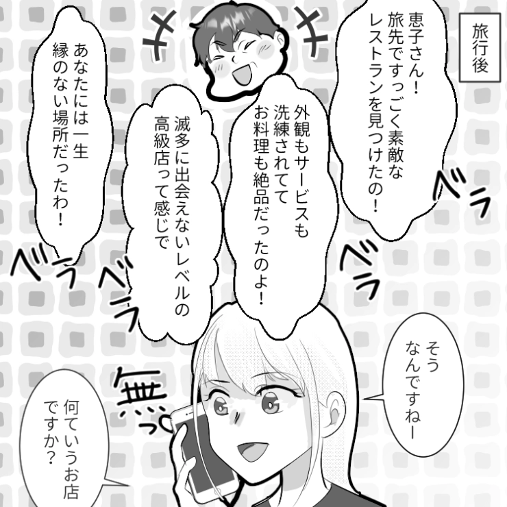北海道旅行から帰ってきた義母は興奮気味に立ち寄ったお店の自慢をするために電話をかけてきました。主人公が何か言おうとしてもいつもどおりばかにして聞く耳を持ちません。しかし、この後義母は平謝りすることに・・・。