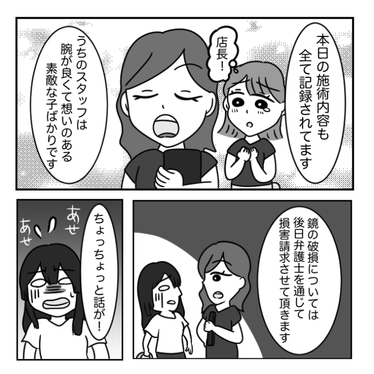 OTHER 2025.08.17後編/「全然違う!詐欺!」アイドルと同じ見た目にしろと言う女!骨格や髪質で完全再現は無理と説明→施術後大騒ぎしたが、慌てて退店することになった店長のスカッと対応は?衝撃のエピソードを漫画化!今回は主人公の働くお店にやってきてアイドルの見た目と全く一緒にしろと言う無理難題を押し付けてきたクレーマーのお話をご紹介します。骨格や髪質によって完全再現は難しいと説明し、同意したにも関わらず仕上がりを見て大騒ぎした迷惑客。しかし、最後は店長のスカッと対応で慌てて退店することに・・・。1234#漫画