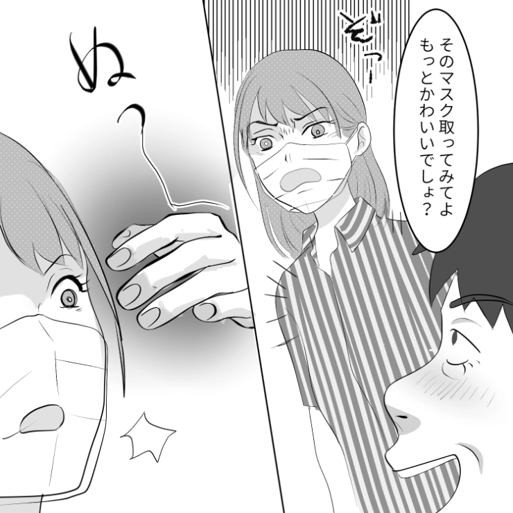 酔っ払いの手が主人公のマスクに届きそうになったとき、ついにある人物が主人公の職場にやってきて、酔っ払いは青ざめることに・・・。