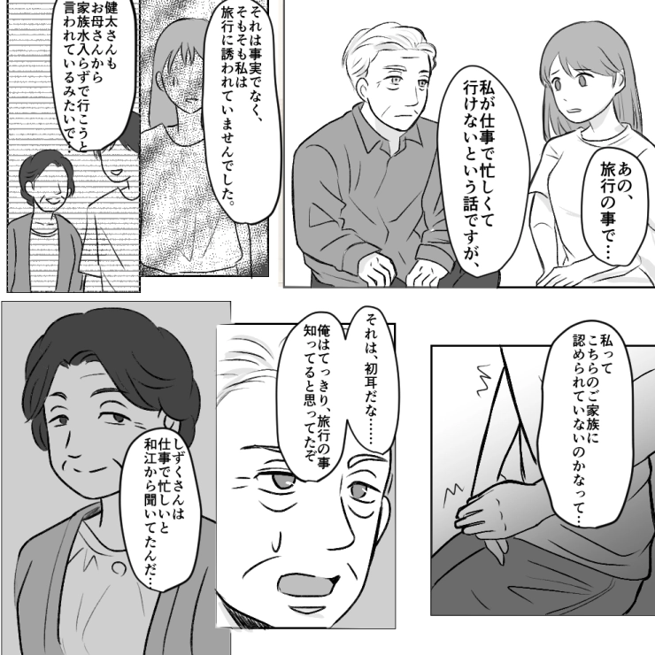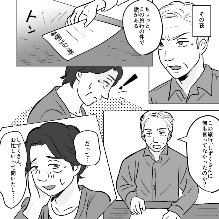 OTHER 2025.08.23後編/「家族水いらずで旅行もいいよね」義母の考える家族には私は入っていない・・・私に内緒で旅行が計画されていることを知った→ある人物に相談して計画を打ち壊した話衝撃のエピソードを漫画化!今回は内緒で義家族が旅行を計画していることを知った主人公がその計画をぶち壊すお話をご紹介します。「家族水いらずで旅行もいいよね」義母の考える家族には私は入っていない・・・私に内緒で旅行が計画されていることを知った→ある人物に相談して計画を打ち壊した話1234#漫画