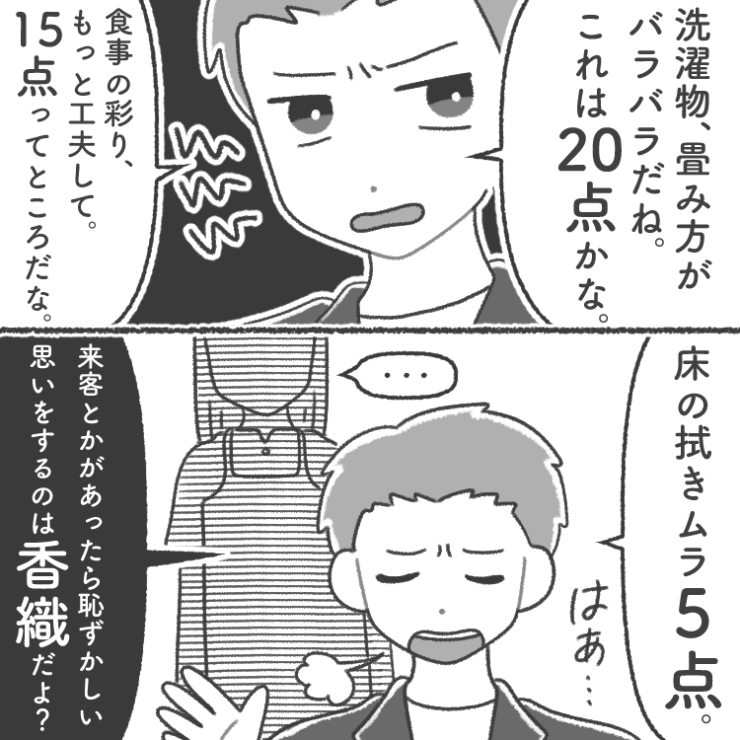 OTHER 2025.09.15「洗濯物の畳み方、20点。味付け、5点」夫の希望で専業主婦のに、私の家事に点数をつけるように!採点される毎日に疲弊→思わぬ救世主が現れ状況が一変し・・・衝撃のエピソードを漫画化!今回は夫の希望で専業主婦になった主人公のお話をご紹介します。家事に専念してほしいという思いを叶えるため専業主婦になったにも関わらず、なぜか主人公の家事に点数をつけ始めた夫は・・・。123#漫画