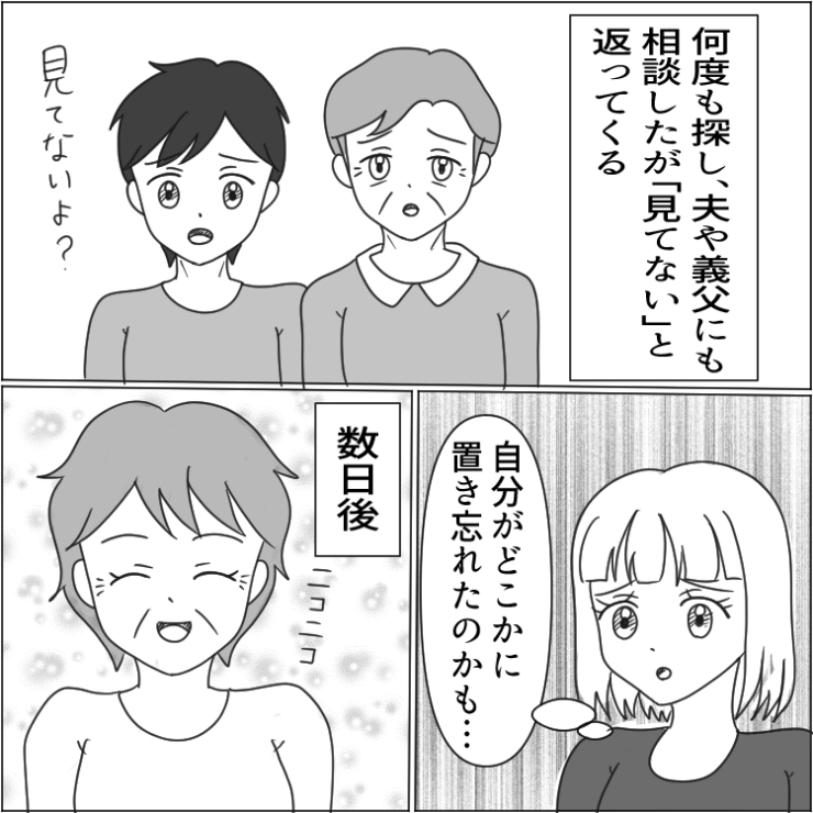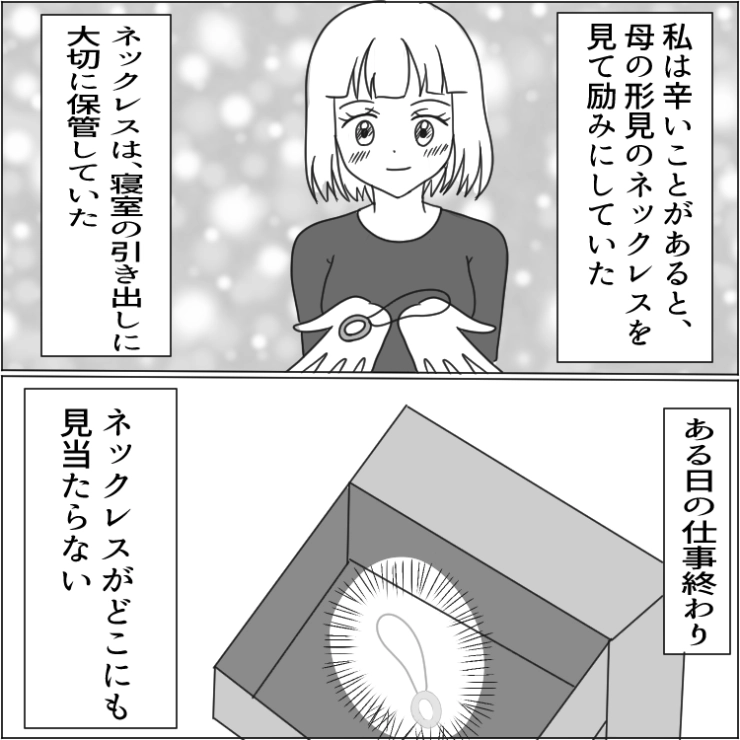 大切にしていた母の形見が見つからない主人公。最初はどこかに置き忘れたかもと思っていましたが、もちろん犯人は・・・。