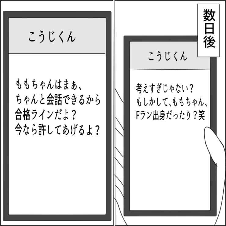 OTHER 2025.09.27「努力したないやつは見下されて当然」合コンでいい感じになったイケメンの正体は偏見まみれの最低人間!デート中も誰かを見下す発言ばかりで指摘したらもっと最低だった・・・衝撃のエピソードを漫画化!今回は合コンでいい感じだと思った男性が実は最低最悪な性格で最悪のデートになったお話をご紹介します。人を見下すような最低発言を指摘しても逆ギレするだけのこうじ。もう改善の余地なしと感じた主人公は静かに連絡先をブロックしたのでした。原作/andGIRL編集部作画/つちやみあ12345#漫画