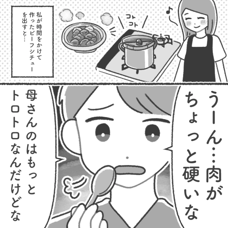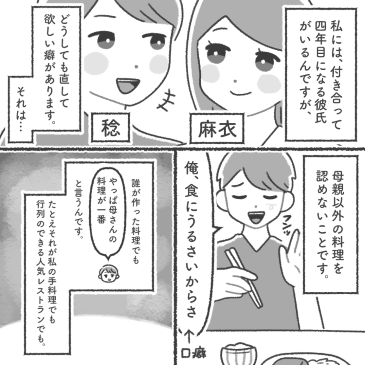 OTHER 2025.10.05「母さんはこんな味付けしない」母親の料理を盲信する彼氏は私の料理を全否定!何を作っても文句でうんざり→彼母が私のご飯を食べて言った思わぬ一言で救われた話衝撃のエピソードを漫画化!今回はどんな料理に対しても自分の母親の料理を盲信して文句ばかり言う頑固者の彼氏のお話をご紹介します。主人公は彼氏と付き合って4年目。彼氏に料理を作るとどんなものでも「母さんの料理が1番美味しい」としか言わないことにうんざりしていて・・・。123#漫画