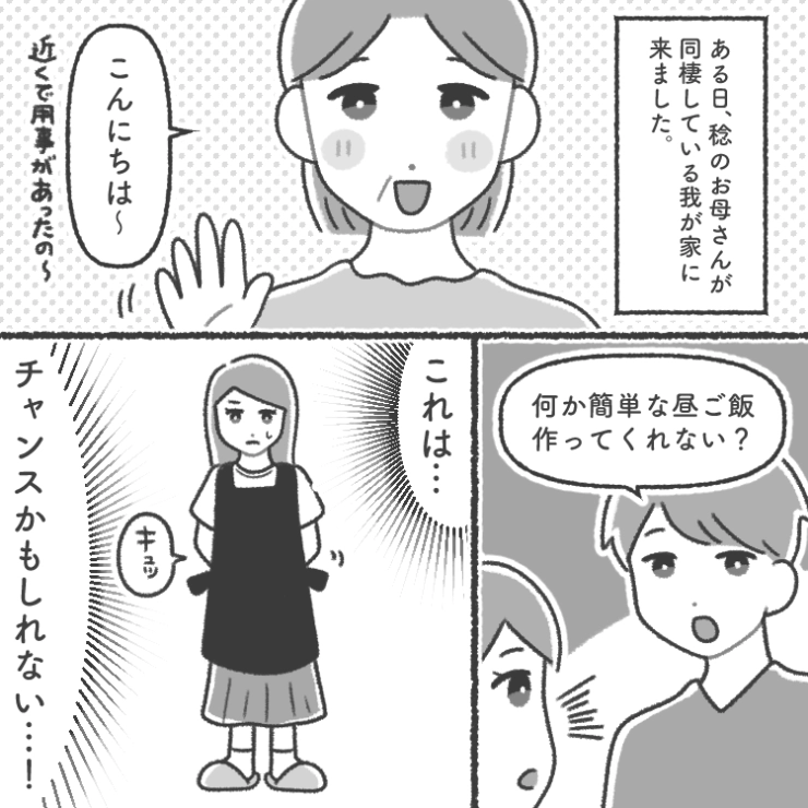 ある日、同棲している家に彼のお母さんがやってくることに。少し緊張しつつもこれはチャンスだと思った主人公。彼母は主人公の料理を食べてどんなことを言うのでしょうか。