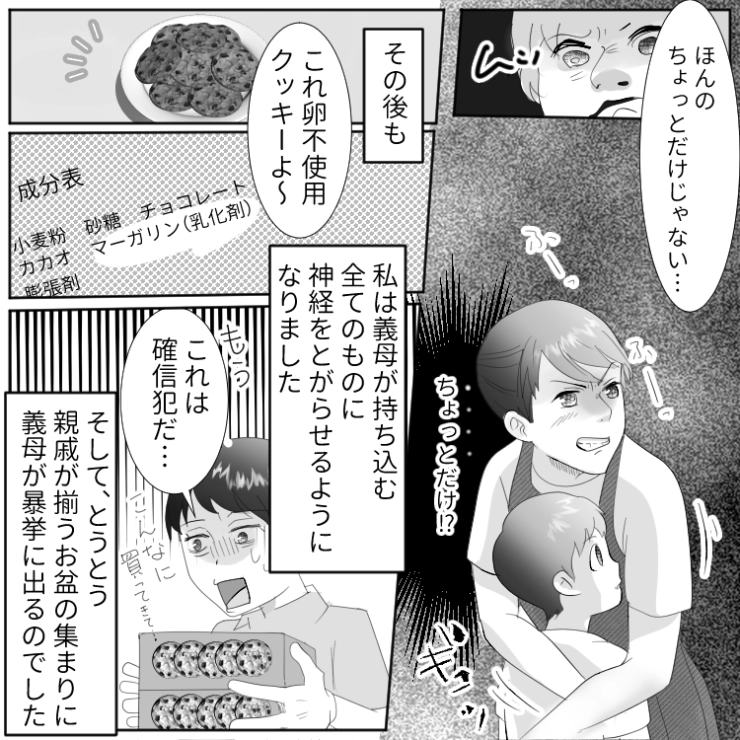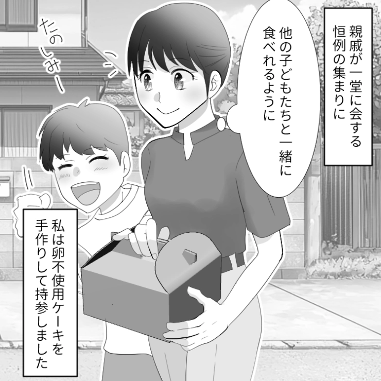 親戚の集まりに卵不使用のケーキを手作りし、持参した主人公。この後、義母の大暴走でついに主人公がブチギレて・・・。