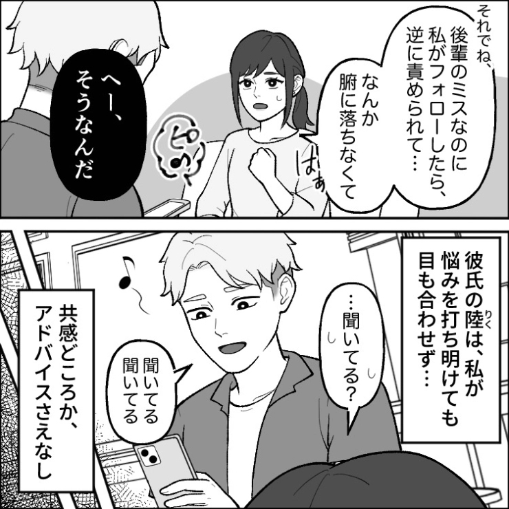 OTHER 2025.10.18「おい、俺の話真面目に聞いてんの?」延々と自分の話はするのに私の話は聞かないどころか遮って自分の話に戻す彼氏!一緒にいても楽しくないので、同じことをした結果・・・衝撃のエピソードを漫画化!今回は自分の話は延々とするにもかかわらず、主人公の話はスマホを操作しながらほとんど聞かない自分大好き彼氏のお話をご紹介します。主人公は彼氏の陸と付き合って3ヶ月。最初は物知りでよくしゃべるところに惹かれたのですが・・・。123#漫画