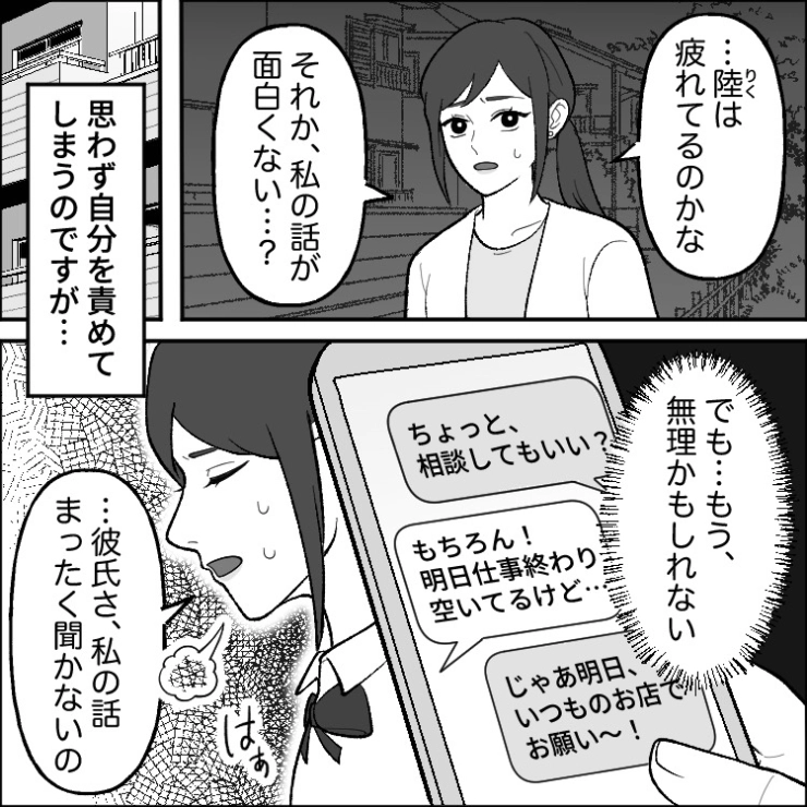 主人公が悩みを相談しても「へー」や「ふーん」だけで終わらせる彼氏。いい加減我慢の限界が来たので友達に相談したら、面白い復讐方法を教えてくれたので・・・。