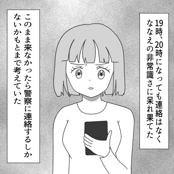 3時間で迎えに来ると言ったのに20時になっても迎えにこないので、イライラしつつも少し心配になった主人公。しかし、この後ななえはさらに非常識な態度で主人公の前に現れるのでした。