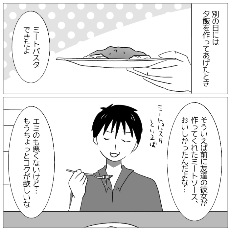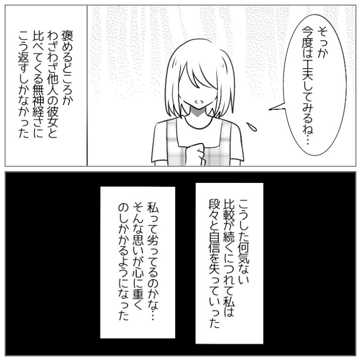 彼氏に貶されるたびに自分に自信がなくなっていく主人公。この後、タイチの友達カップルとご飯に行く機会があり、そこでついに我慢の限界を迎え・・・。