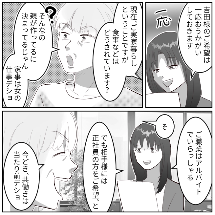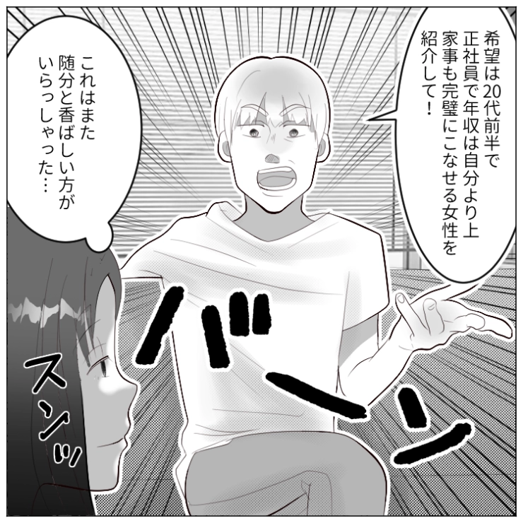 OTHER 2025.11.02「俺には大人の包容力がある」結婚相談所で20代前半・正社員・家事も全部やってくれる人を希望する40代フリーター男!現実が見えていないので、ある方法で現実を教えた話衝撃のエピソードを漫画化!今回は結婚相談所にきた現実が全く見えていない40代後半、フリーター男に現実を見せたお話をご紹介します。123#漫画