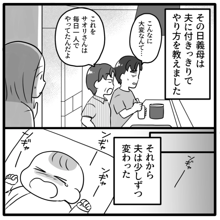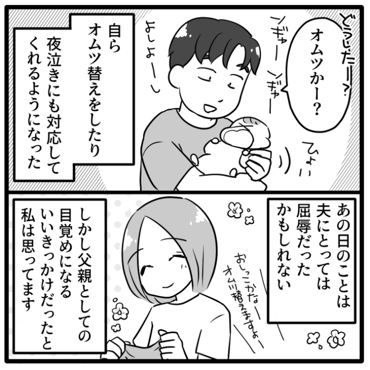 自分が何もできないことを咎められさすがに反省した夫。それからというもの、積極的に育児をしてくれるようになったので結果オーライかなと思った主人公でした。