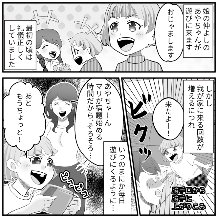 OTHER 2025.11.15「うちは放任主義!好きにさせて!」我が家に上がり込んで冷蔵庫を勝手に漁ったり、化粧品で遊んだりする娘の友達!親に注意をしても的外れの回答なので・・・衝撃のエピソードを漫画化!今回は娘の友達の放置子が主人公のおうちに勝手に上がり込んで大暴れするお話をご紹介します。主人公の娘には仲が良いお友達のあやちゃんがいるのですが、この子に最近困らされているようで・・・。123#漫画