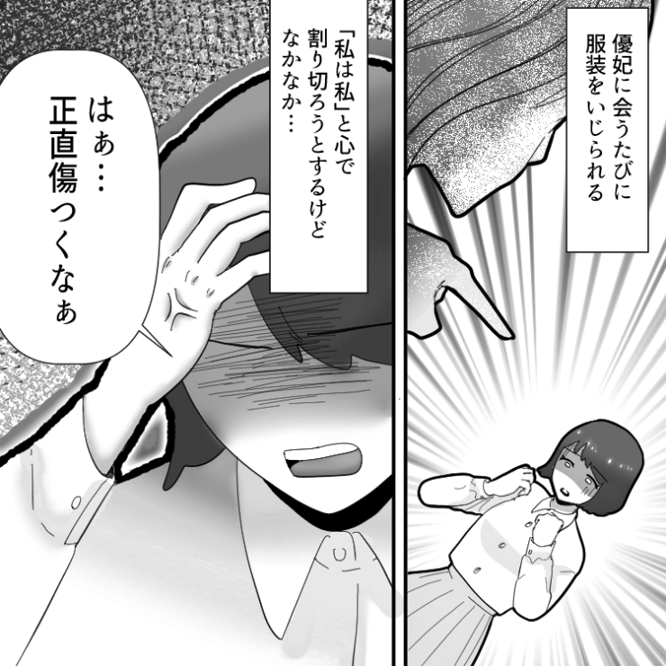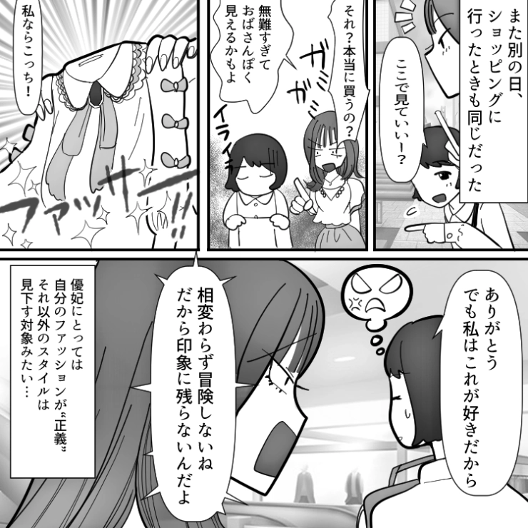 好きな服を着ているだけなのに毎回バカにしてくる幼なじみにいい加減イライラが我慢できなくなってきた主人公。しかし、この後幼なじみが二度と主人公に嫌味を言えなくなる出来事が・・・。