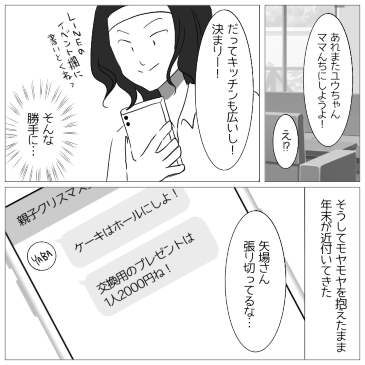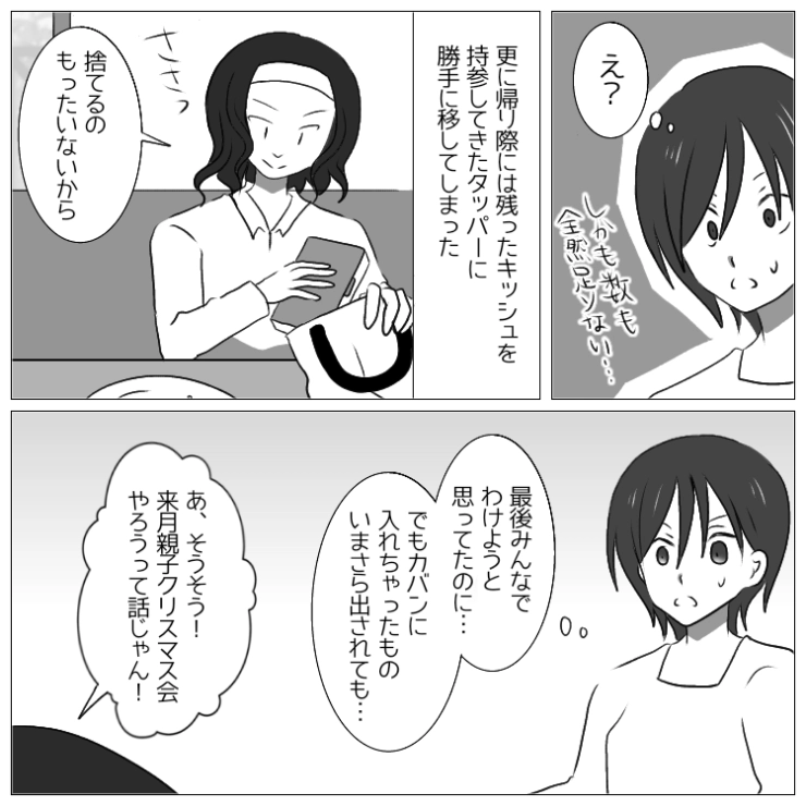 自分はデパ地下のお惣菜は持ってこないのに残ったものは誰にも許可をとらず、すぐに自分のカバンにしまうというせこさを発揮するママ友!この後、このママ友のせこさに悔い改めさせる作戦を実行しようとして・・・。