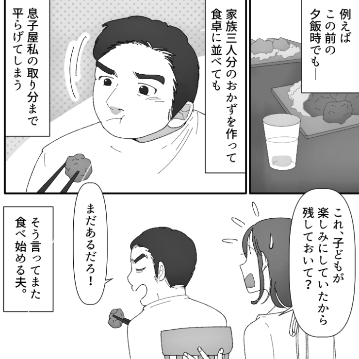 OTHER 2025.12.13「食べるなって言うのか?俺だって腹減ってるんだ」食事を出すと息子の分まで食べ尽くしてしまう夫!他人を思いやれない姿に腹が立ったので、お望み通りにしてあげたら・・・衝撃のエピソードを漫画化!今回は食卓に並べた食べ物は息子の分まで全て食べ尽くす夫のお話をご紹介します。主人公には深刻な悩みがあるようです。それは夫の食べ尽くし癖。自分だけが我慢するならまだしも食べ盛りな息子の分まで食べ尽くしてしまうようで・・・。123#漫画