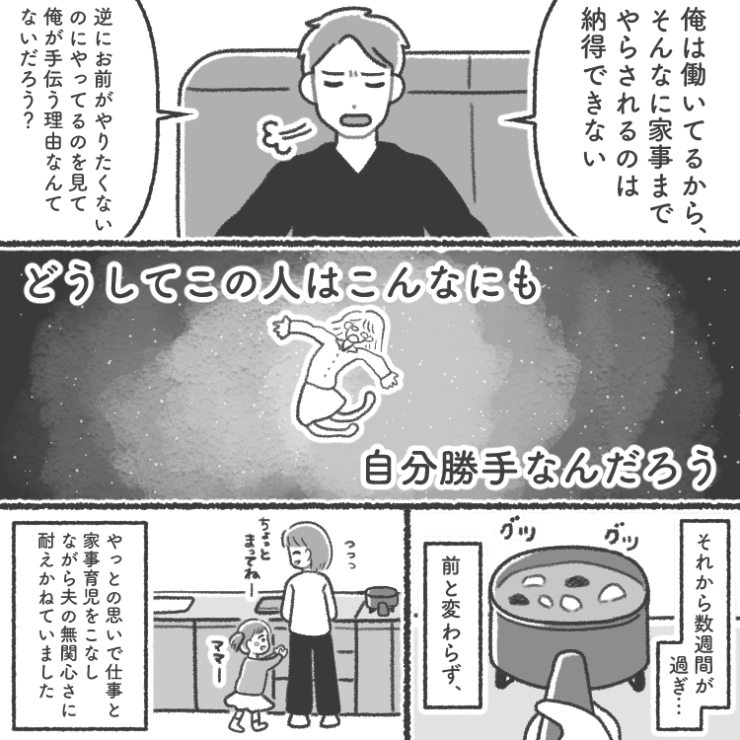 OTHER 2025.12.20「俺は毎日忙しい。お前が全部やるべき」共働きなのに家事も育児も一切しないくせに偉そうな夫!少しでいいから手伝ってと何回お願いしても無視→限界に達した私は・・・衝撃のエピソードを漫画化!今回は共働きにも関わらず、家事も育児も一切やらない夫のお話をご紹介します。「お前の稼ぎは大したことない。働いた気になるな」共働きなのに家事も育児も一切しないくせに偉そうな夫!少しでいいから手伝ってと何回お願いしても無視→限界に達した私は・・・1234#漫画