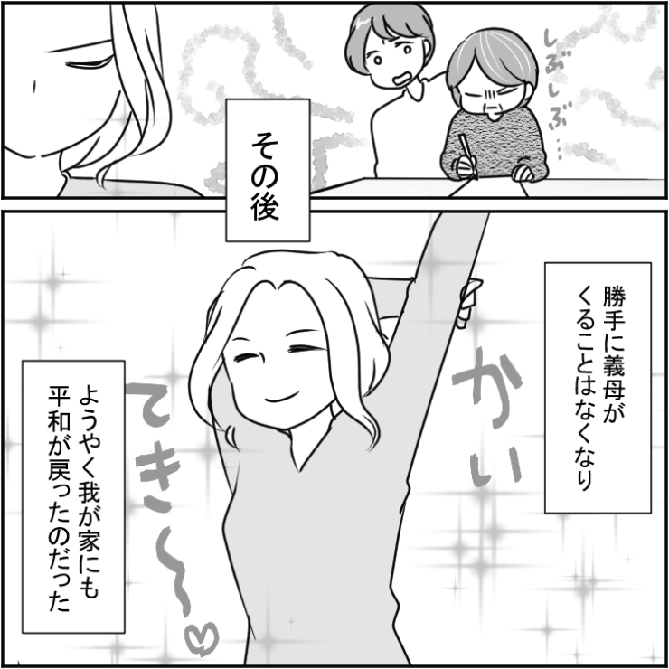 頼りにならない夫には頼らず自力で義母を追い払うことに成功した主人公。ようやく平和が戻ったのでした。