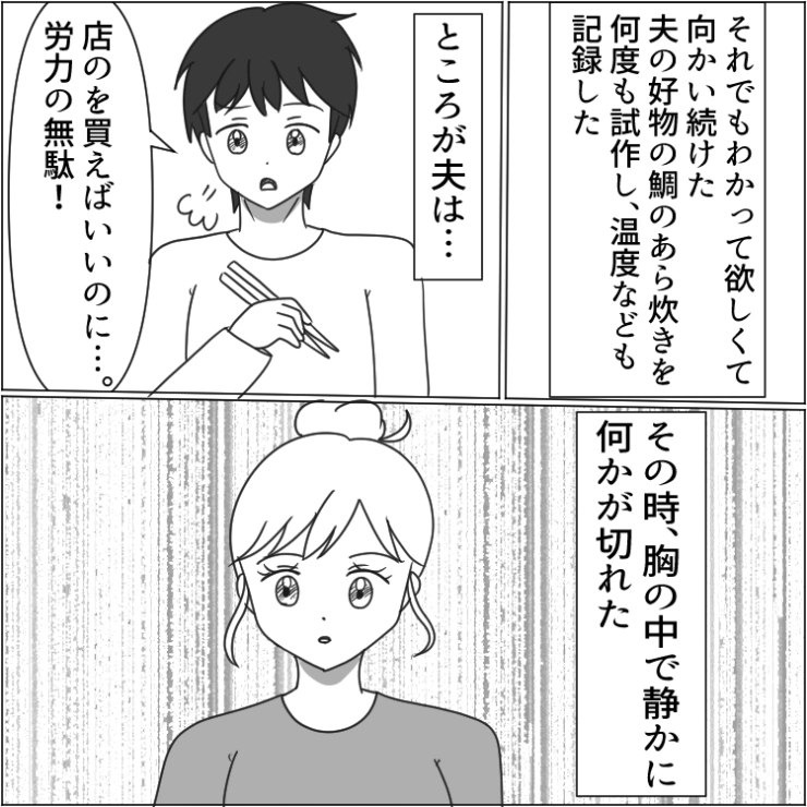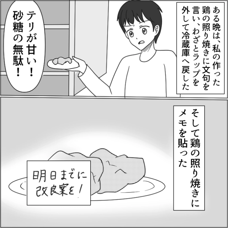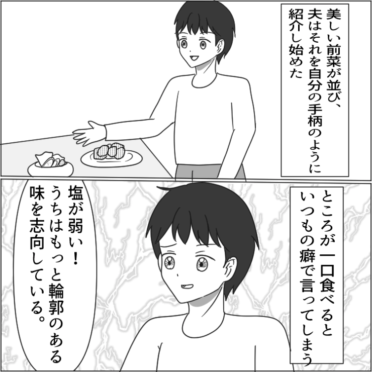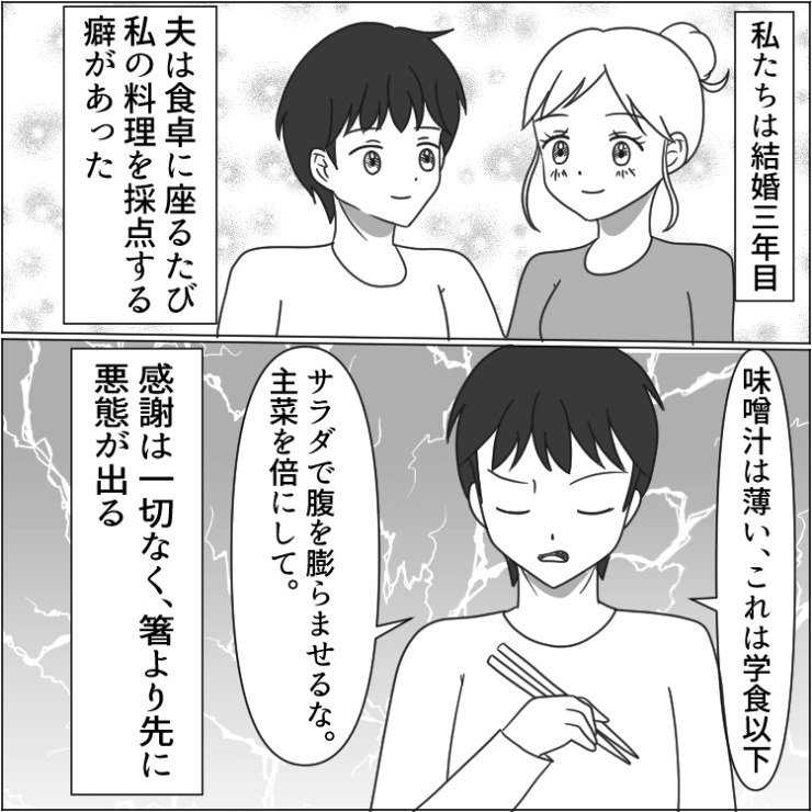 主人公は結婚して3年目になる。結婚当初から夫は主人公が作った料理にコメントをする癖があり・・・。