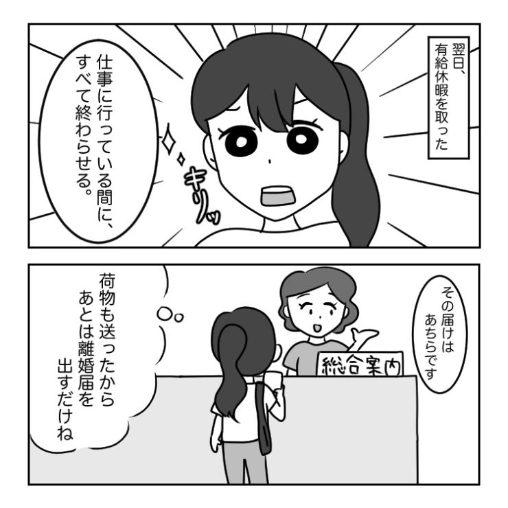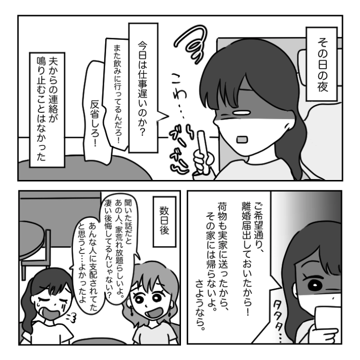 夫の望み通りに離婚届を提出した主人公。最後の最後までモラハラが止まらなかったところをみると早々に離れて正解だったのかもしれません。
