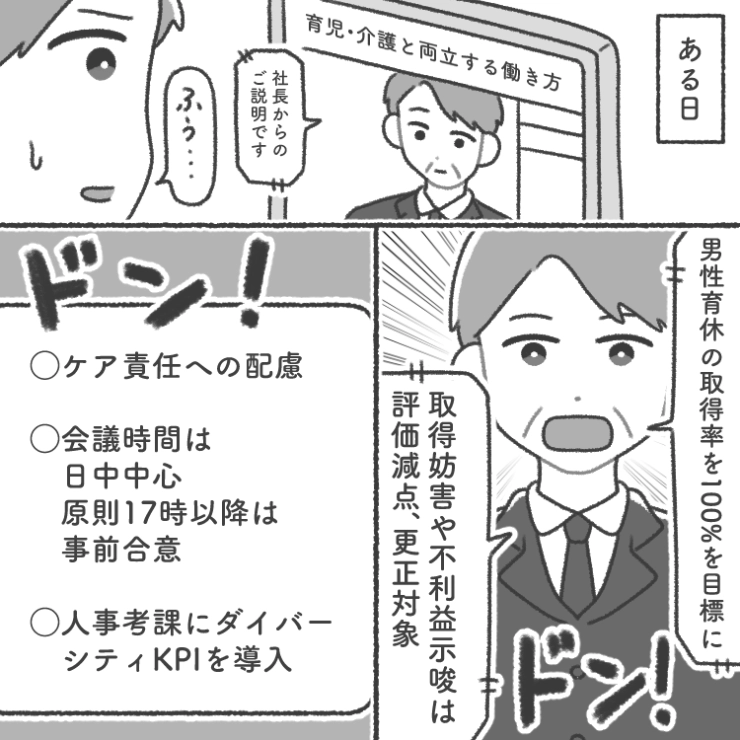 衝撃のエピソードを漫画化!今回は男性の育休取得や子育てとの両立をする女性に差別的な発言や行動をする上司のお話をご紹介します。