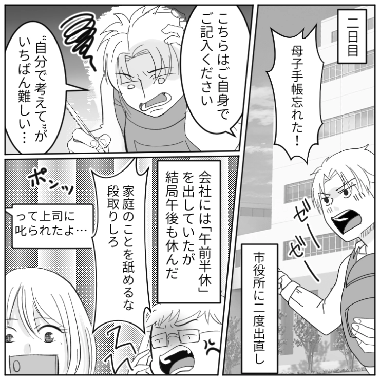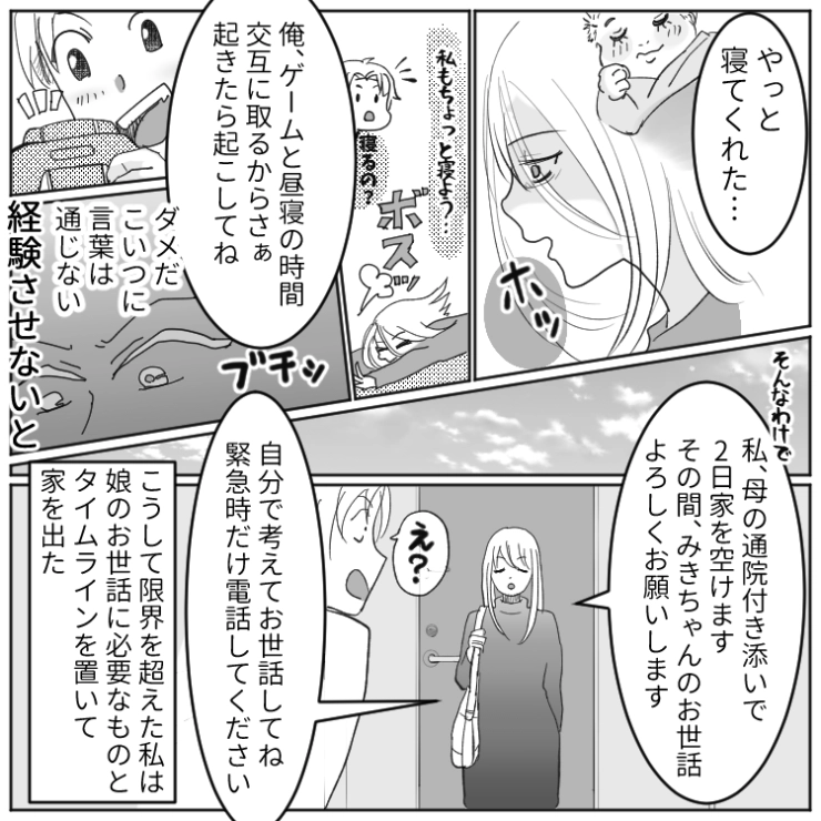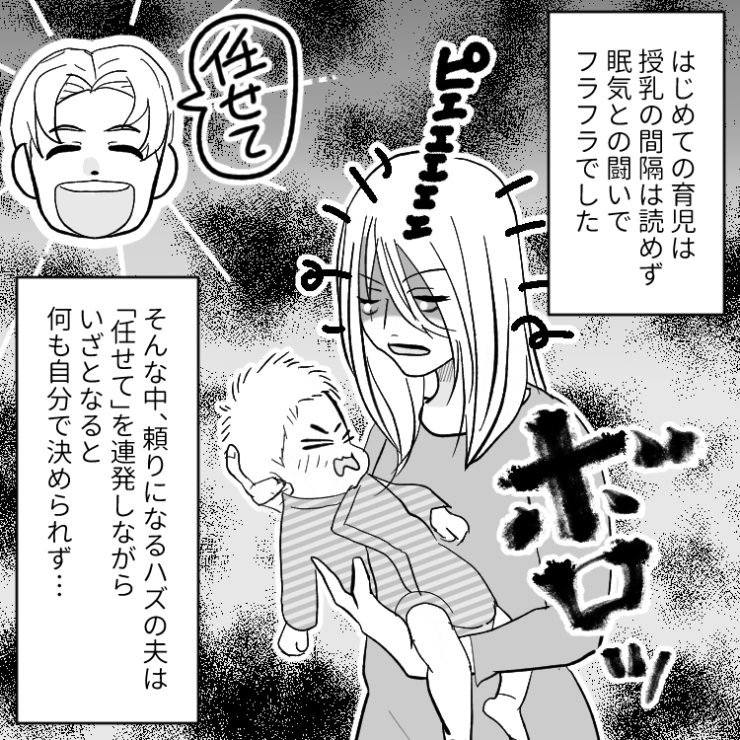 主人公は初めての育児で心も体もボロボロ。頼りにしたいはずの夫は「任せて!」と口だけで何もできず・・・。